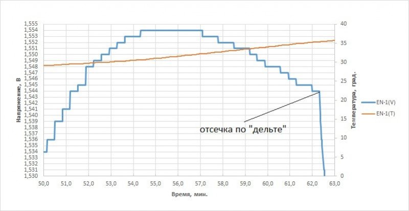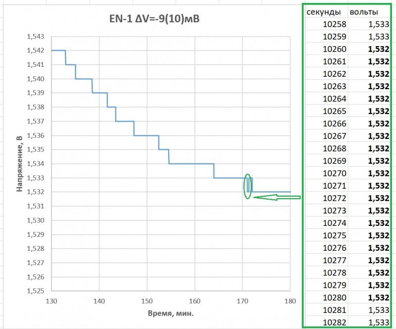 Здесь есть один нюанс: в лог записываются «верхние» значения напряжения, а определение ∆V происходит по «нижним», в моменты пауз, которые в лог не пишутся. Но ∆V по «нижним» или такая же как по «верхним» или чуть меньше.