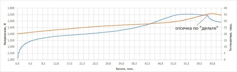 Вот такой он, метод "-∆V". «Самый продвинутый» и при этом самый капризный из всех ныне используемых. Ибо должно выполнится ряд условий и ЗУ в течении отлавливания «дельты» (а это не одна минута) не должно учудить вверх ни на милливольт по НРЦ во время краткосрочных пауз по нагрузке.