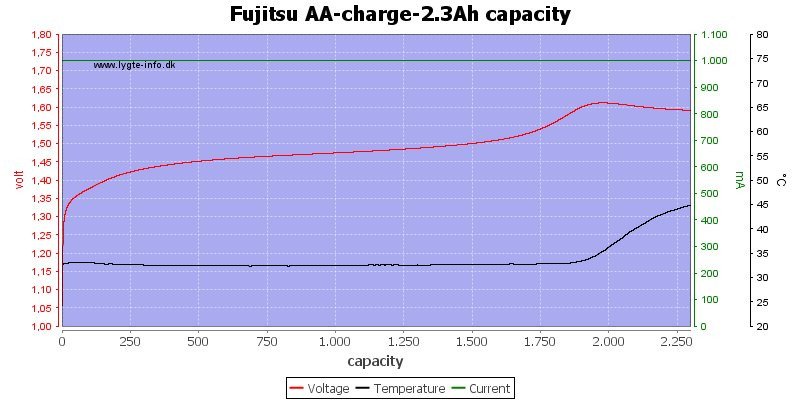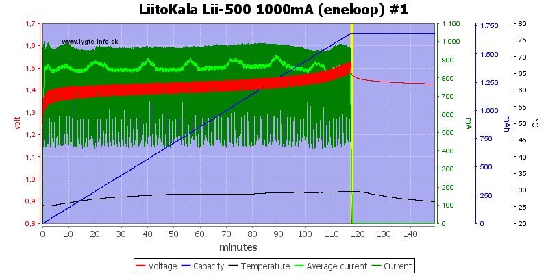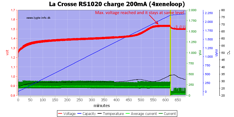 Кислородный цикл — это побочный процесс, причем экзотермический (идет с выделением теплоты). Не только бесполезный, но и вредный. Электроэнергия тратится впустую, превращается в тепло, а значит увеличивается температура. Обратите внимание — это не джоулево тепло. Это как бы «химическая» добавка к джоулеву теплу: суммарная теплота, выделяющаяся при протекании двух химических процессов — генерации молекул О₂ на МГЭ и их уничтожении на ОНЭ. На картинке ниже кривульки, снятые для процесса заряда 4 ячеек АА током 0.5С (1.1А):