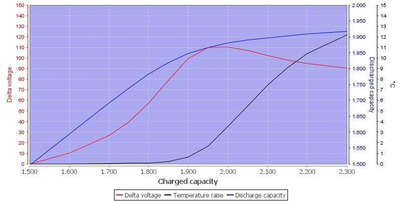 ►После 95-100%, особенно при больших плотностях тока становится заметным и переразряд (Ni⁺³ → Ni⁺⁴), так же как кислородный цикл идущий с выделением тепла. Потому что переразряд — это тоже цикл (Ni⁺³ ⇆ Ni⁺⁴), но с более медленной диссипацией энергии.