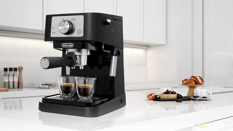 Сама DeLonghi EC 260 BK оказалась практичнее и красивее дизайном. Обзорщики и ютуберы нахваливали ее за бойлер из нержавеющей стали, за два отдельных термостата для контроля температуры воды и пара, верхнюю металлическую площадку для подогрева чашек и прочие технологические решения.