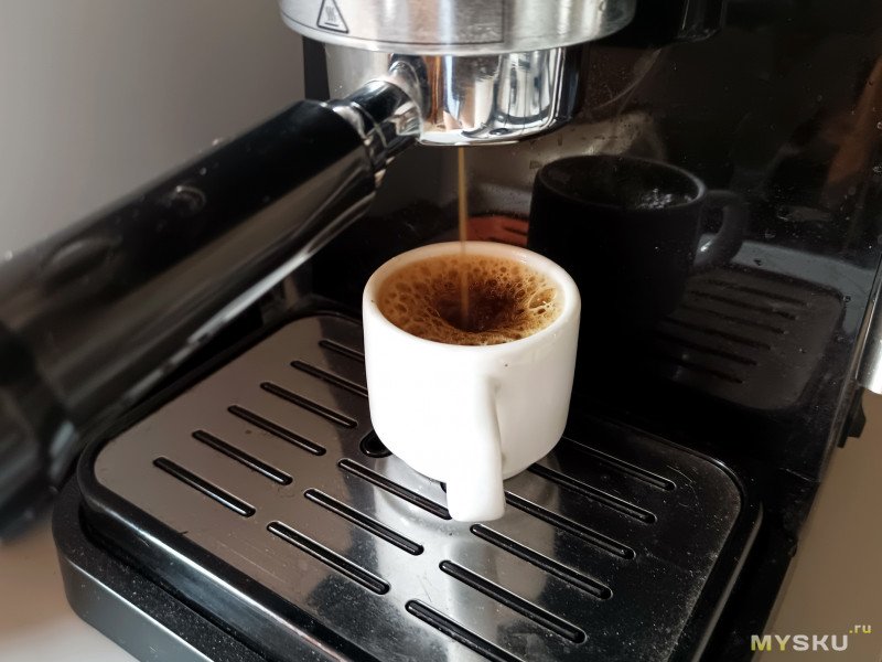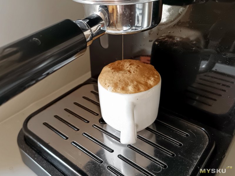 Но это в теории. На практике вышло немного иначе. Во время получения напитка через двойную корзину на Delonghi EC260 била струя с таким давлением, что пена поднималась огромными пузырями, как пивная шапка.