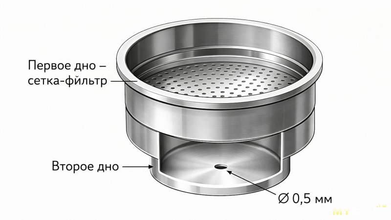 Работает она так. Верхняя сетка — фильтрующая корзина. Нижняя — ограничитель потока через одно центральное отверстие диаметром 0,5 мм. Между ними есть пространство (камера), в которой создается нужное давление. В итоге, мы получаем крепкий напиток с хорошим крема.