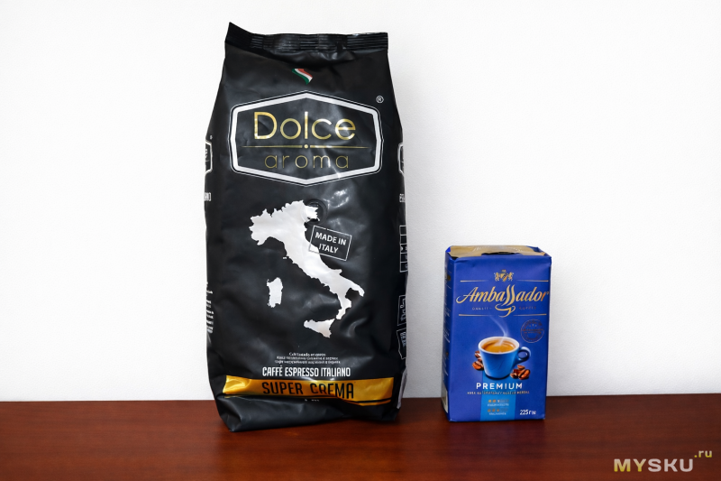 Поэтому делаю микс из молотого кофе Ambassador Premium и перемеленных зерен Dolche Aroma Super Crema (80% арабики, 20% робусты).