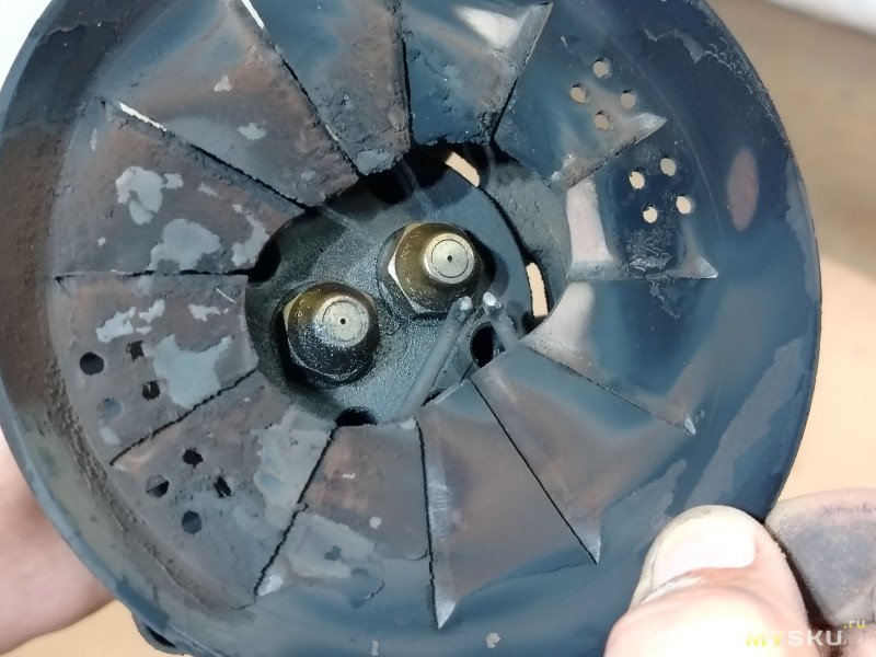 Это на фото не дизельная, а комбинированная — газ/дизель горелка, толстые веером, пучком, трубы — это подача газа. Труха на тарелке — пыльно в котельной и помпажит связка котёл-дымоход и вообще эта топливная рампа говёная. Разровнять факел производитель пытался дырками в тарелке, хрень получилась. Белые пятна слева — преимущественно работает на первой ступени. Правы электрод стоит кривовасто. Если форсунки на 45гр, поджигать будет неустойчиво.
