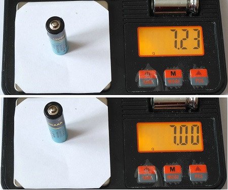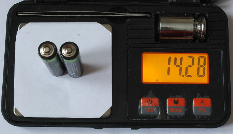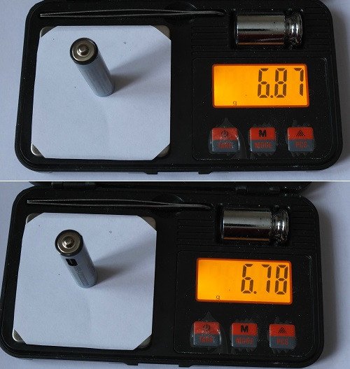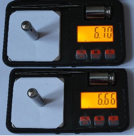 Как и было заявлено, полный заряд элемента занимает ~40 мин.Взвешивание — оба экземпляра имеют одинаковую массу 7.14 г.