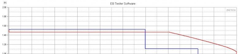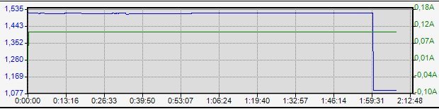 Шкала времени утилиты MC3000_Monitor_V1.06 весьма условна (всегда занижает). В любом случае, реальные численные значения мАч и мВтч всегда вытягиваются из лог-файла.Вторая (информационная) ступенька в наличии. После ее окончания напряжение отрубается контроллером и МС3000 прекращает запись. Поэтому продолжение кривой «в ноль» на графиках отсутствует.