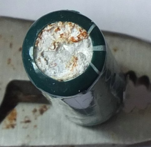 Образовался слой чего-то белого порошкообразного (думаю, комплексной соли лития), а летучий растворитель электролита (смесь органических в-в) уже давно испарился. На фото: по центру я уже поковырял острием скальпеля. Явление довольно редкое, но в принципе и такое может быть.