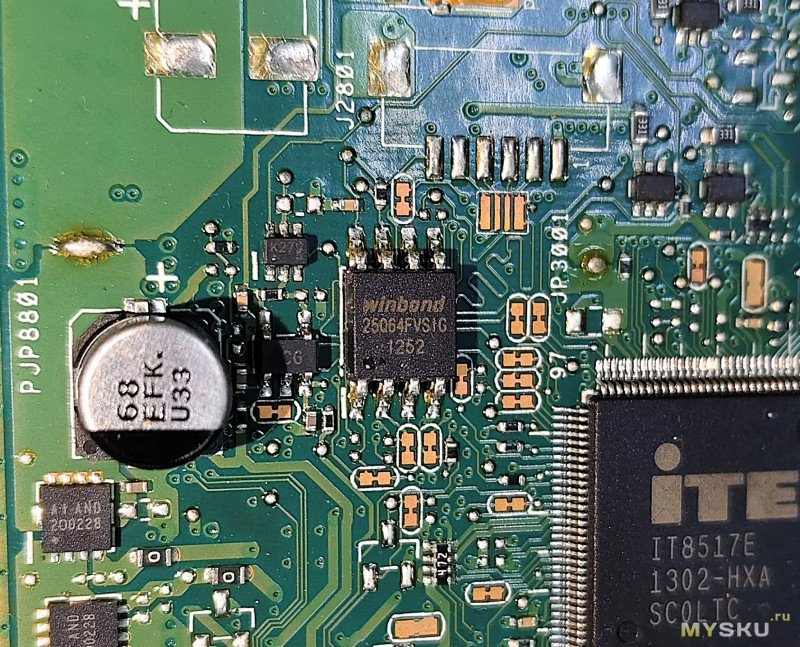 Для снятия ограничения нужно снять дамп биоса — с ним и будет работать. Для этого ищем флешку на плате с маркировкой 25q32/25q64 (возможны другие маркировки). В этом ноутбуке она расположена рядом с мультиконтроллером IT8517E