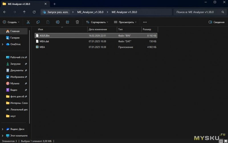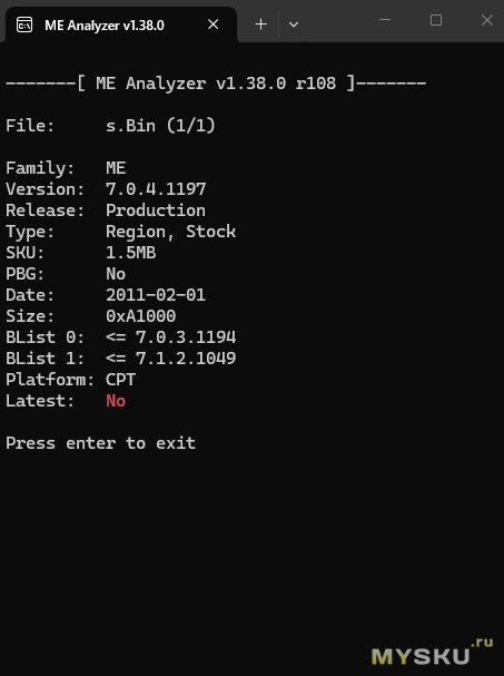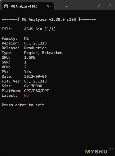 Теперь нужно узнать, какая версия и размер me region в считанном дампе (биосе ноутбука). Копируем дамп в папку с программой MEAnalyzer и переносим его на программу MEA.