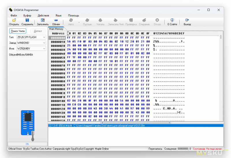 ПО программатора верно определило тип микросхемы, без проблем считало. Сохраняем дамп на компьютере (в формате bin).