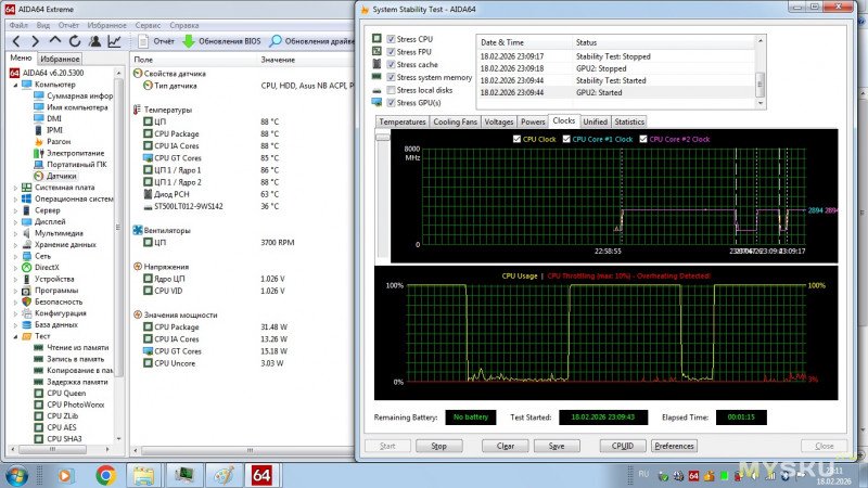 Нагрузим еще и видеочип. Вот тут уже и обороты кулера поднялись, температура ближе к 90 гр подошла да и троттлинг cpu начал срабатывать.