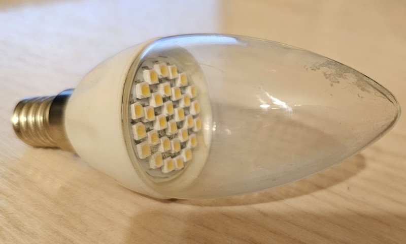 Обычно светодиодная лампа состоит из цоколя, непрозрачного пластикового корпуса и прозрачного(или не совсем прозрачного) пластикового же рассеивателя, под которым скрыты светодиоды со схемой питания. Здесь мы видим попытку закосить под лампу накаливания с матовой колбой: