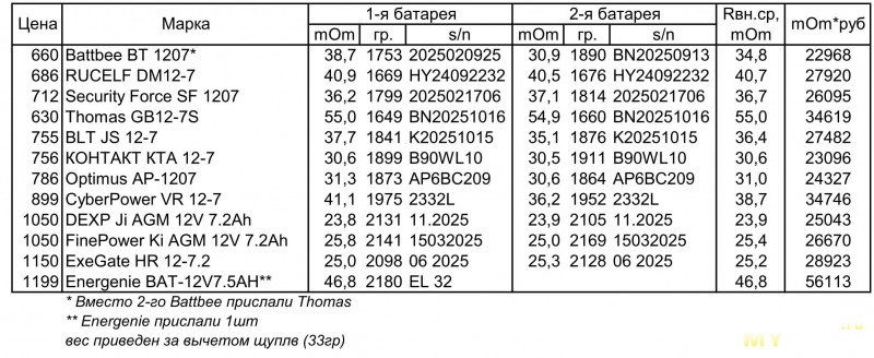 Было заказано по 2 АКБ каждой марки из самых дешевых в онлайне (WB) и офлайне (DNS). Каждая была измерена на вес и Rвн. Властью данной мне PlusPda я ввожу новую единицу измерения – миллирубли (mРуб), как произведение Rвн (mOm) x цену (руб). Чем ниже – тем лучше.