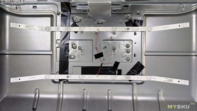 Снимаем рассеивающие свет плёнки (не разделяем) и вот добрались до планок подсветки. Всего их 2 шт, 12 шестивольтовых светодиода.
