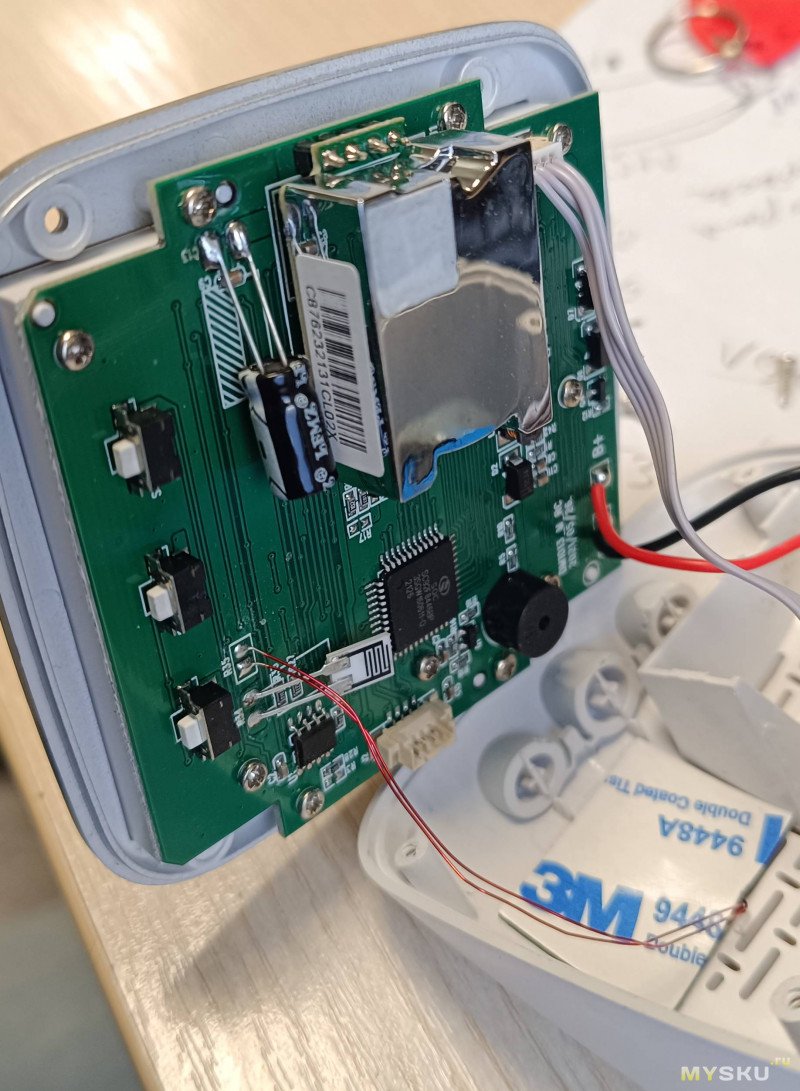 Термодатчик на коротких проводках приклеен к задней стенке, отлепляется нормально: