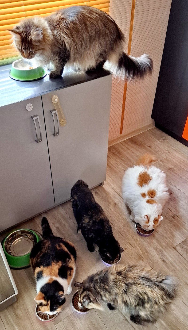 В помещении постоянно тусят пять разнокалиберных кошек и одна недособака: