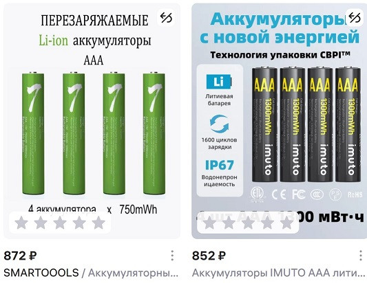 Были выбраны два набора ААА Li-ion 1.5В по 4 экз. (меньшее количество не бывает в продаже, можете не искать) от вендоров, имеющих минимум негативных отзывов и при этом относительно недорогих.