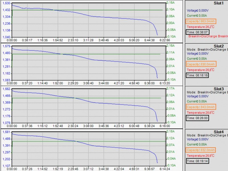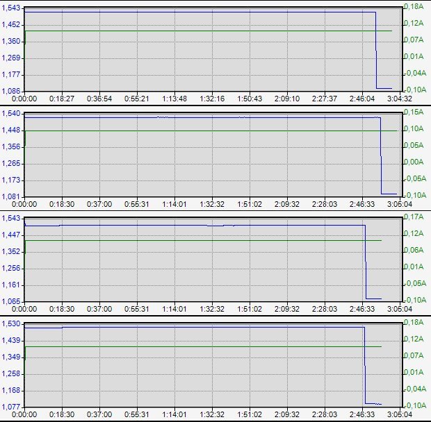 Вторая (информационная) ступенька в наличии. После ее окончания напряжение отрубается контроллером и МС3000 прекращает запись. Поэтому продолжение кривой «в ноль» на графиках отсутствует.Примечание. Шкала времени на графиках весьма условна (всегда занижает). В любом случае, реальные численные значения мАч и мВтч вытягиваются из лог-файлов.