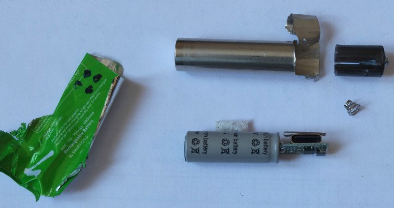 Кстати, скрутка Li-ion находится в трубке, открытой с обоих сторон. Растворитель летит и пахнет уже в начале разборки.
