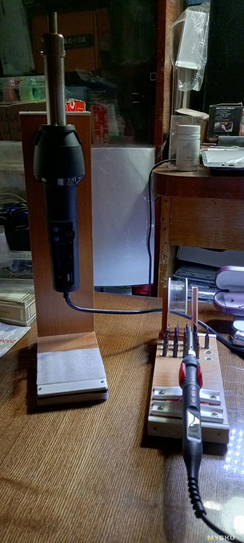 И у подставки для фена так же наклеена такая пластинка, что с одной стороны отучило его от "прогулок" по столу из-за вибрации при работе турбинки, и вдобавок решило проблему "А как разместить габаритный фен на минимальной площади?" — он раза в полтора с лишним длиннее тех которые подключаются к отдельному блоку питания и управления или к паяльным станциям т.к. эта электроника расположена в его ручке, а не вне его.
