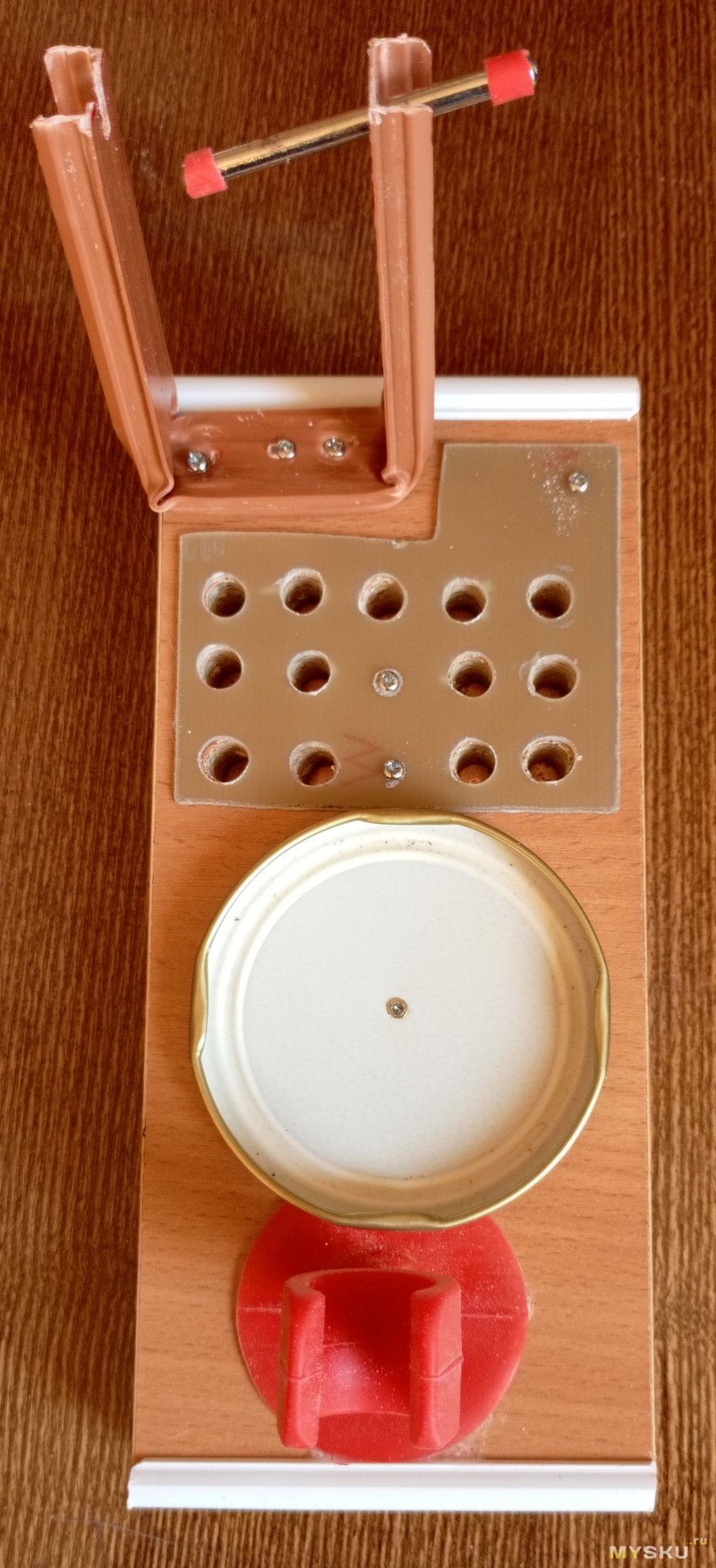 Я вот к примеру сделал подставку под паяльник заново не из-за красоты, а потому, что материал ДВП и сверля его сверлом 6,5 «в глухую» я не учёл, что диаметр отверстия в итоге будет меньше и имеющие диаметр 6,5 мм жала 900М-Т не войдут в них. Пришлось дримелем с фрезой растачивать и… вышло много, дырки не глубокие, вот жала и болтались. Пришлось делать заново, но уже сверлил 7,0 (сверла 7,5 у меня нет) ибо 8,0 опять будут болтаться, и насквозь, а внизу пластина стеклотекстолита в роли крышки. Вся работа заняла минут пятнадцать, ну ещё с полчаса подождал чтобы силиконовая подставка JCD приклеилась циано-акрилатом марки 510 Metal — я уже знал, что из-за упругости силикона и неидеальности формы присоски она плохо держится на лаке, пластике или металлических поверхностях и быстро от них отклеивается, но не был уверен что клей возьмёт силикон — пластик, нержавейку, собственную шкуру — да и замечательно, а тут я пробовал и нанёс клей на всю внутреннюю поверхность присоски. Ну, сейчас могу сказать берёт, и не плохо, пока не отклеилась.:)