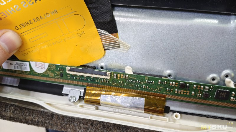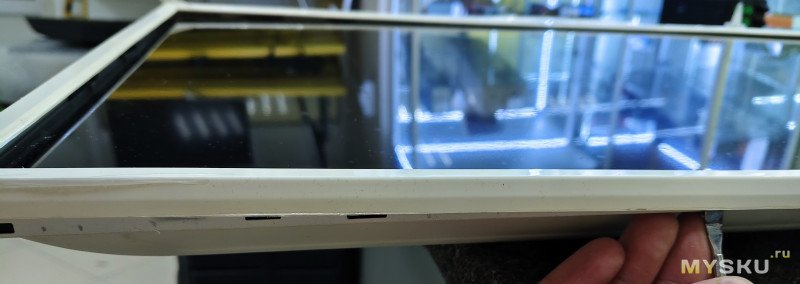 Собираем всё в обратной последовательности. После установки матрицы и перед установкой внешней рамки проверьте, что бы все её стороны и углы располагались в углублении рамки. Там по краям рамки между пластиком и стеклом приклеены резинки — смотрите, что бы матрица не лежала на них. На стекло не давить!