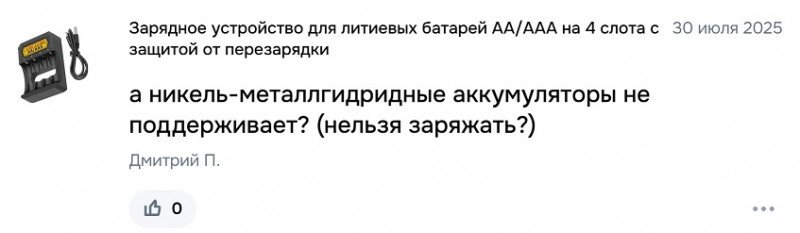 Но «наши люди» (Бриллиантовая рука) надписи на девайсах не читают. Особенно на обратной стороне и мелким шрифтом. Надо отдать должное покупателю, задавшему вопрос — он прочитал. Но не поверил.Поэтому часть покупателей втыкали, втыкают и будут втыкать все что лезет в слоты той коробки. И любых подобных коробок для Li-ion-1.5В. Это аксиома.