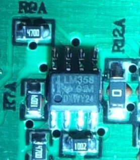 Плата явно разделена на 2 одинаковых сегмента (что видно даже по маркировке), обслуживающих пары слотов: 1+2 и 3+4.В каждом сегменте свой сдвоенный (двухканальный) операционный усилитель LM358. Классика жанра. Каждый канал обслуживает один двухцветный светодиод красный/зеленый.