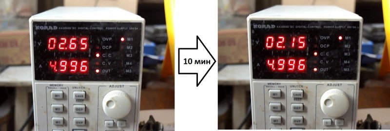 Пошел ток 2.2А. А напряжение просело только до 4.65В, а через 2 мин. дошло до 4.85В. Сабж сразу запустился (зажглись светодиоды).