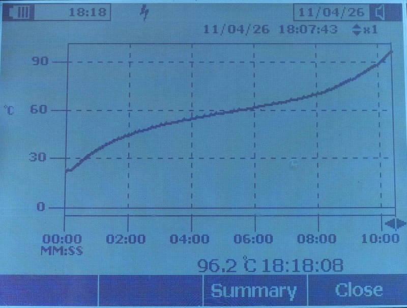 После 65-70ºС начались легкое потрескивание каждые 2-3 сек. Возможно, срабатывал клапан сброса давления. Через 10 мин. 26 сек. температура достигла значения 96.2ºС и я отключил нагрузку. Здоровье дороже.