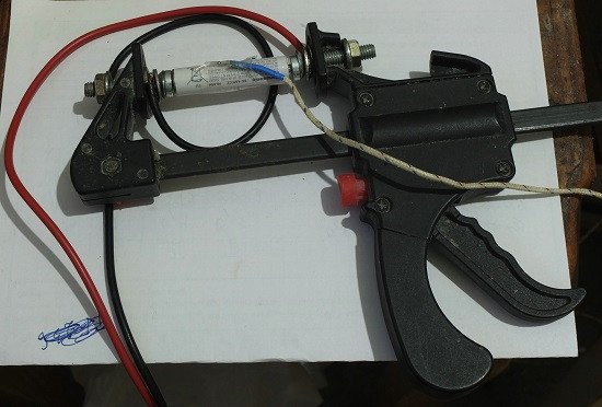 Нашел старенькую струбцину-держатель, вставил образец, примотал скотчем термопару.