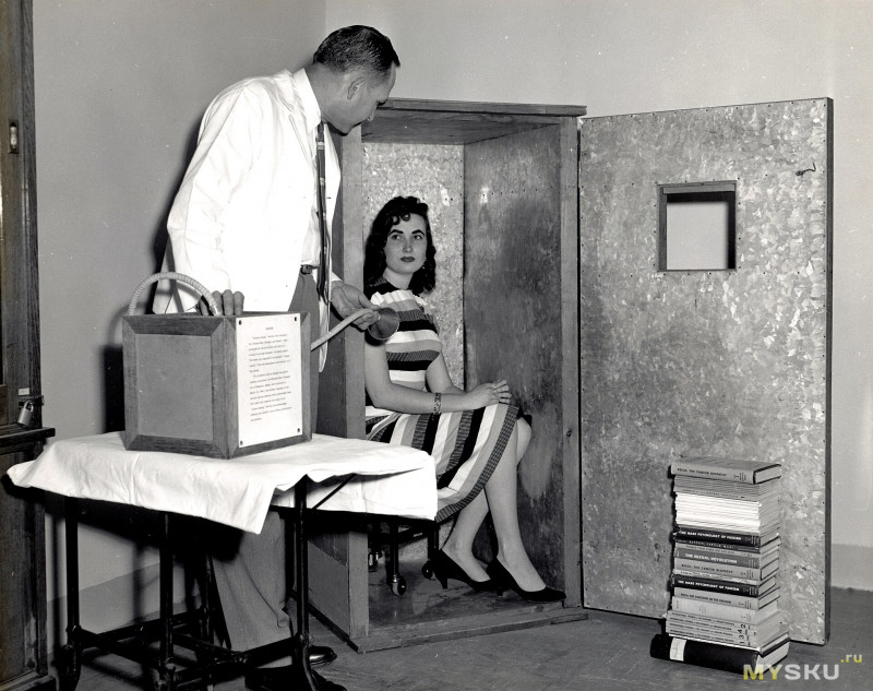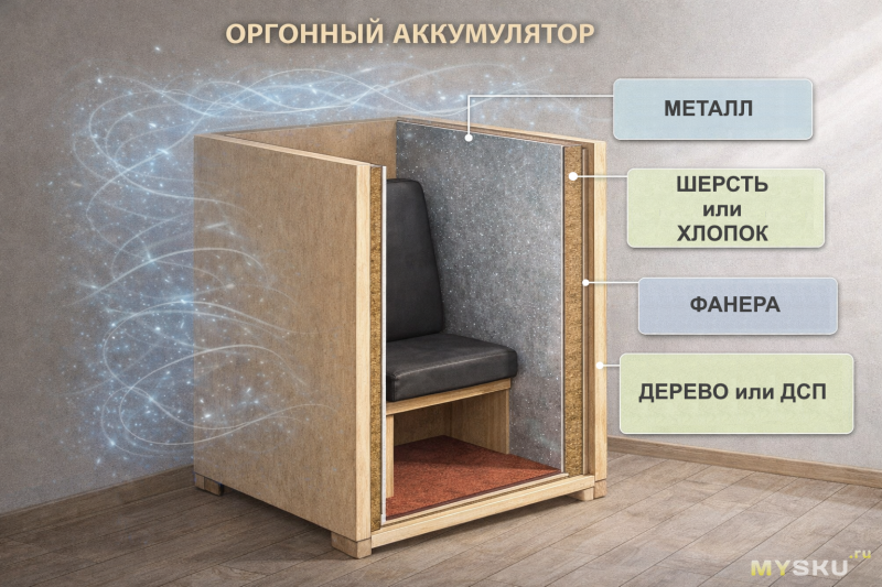 Поэтому оргон можно (и нужно) накапливать. Для этого ученый создал концепцию «оргонного аккумулятора» — устройства, состоящего из чередующихся слоев органических (дерево, хлопок, шерсть) и неорганических (металл) материалов. Органика притягивает оргон, неорганика — накапливает и отдает.