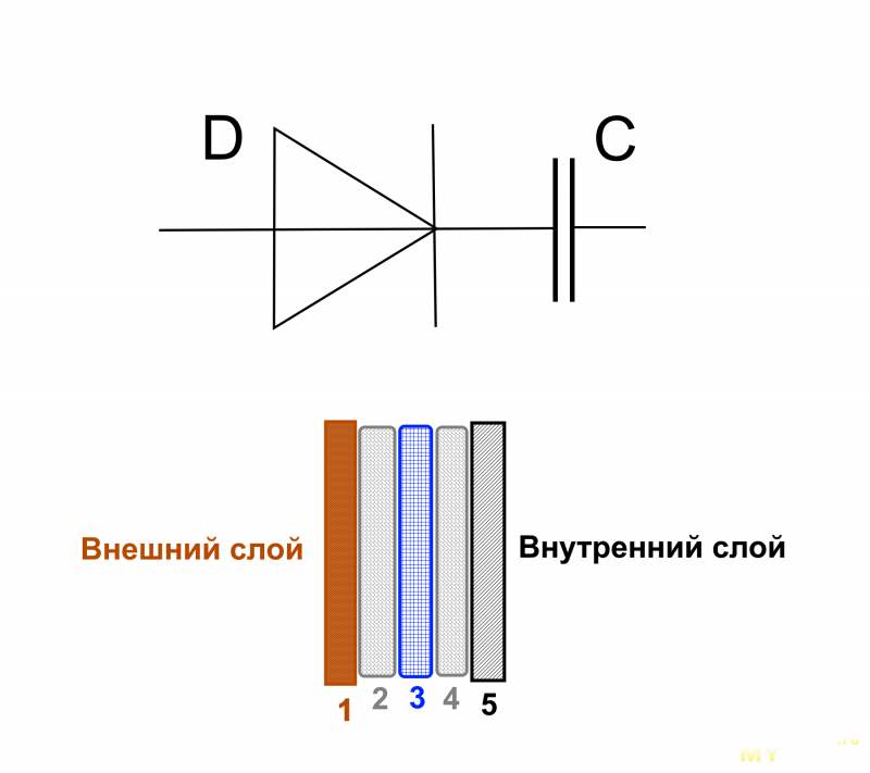 Оргонный аккумулятор как «слоеный пирог». Такая структура, по мнению Райха, способна притягивать и удерживать биологическую энергию (оргон) из атмосферы. Эта конструкция работает по принципу «энергетического диода». Энергия течет от органического слоя к металлическому по аналогии работы электрического диода. Чередуя слои (например, 3, 5 или 20) можно накапливать энергию — тут уже прямая аналогия с конденсатором. Чем больше пар слоев (органика + металл), тем выше концентрация энергии внутри.
