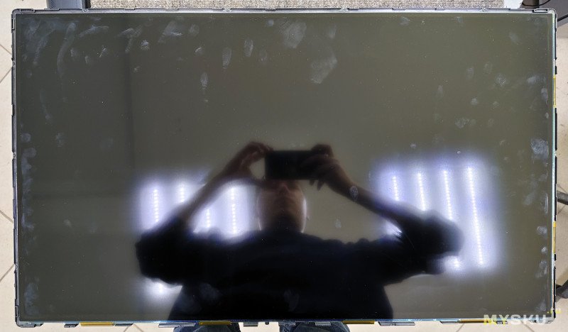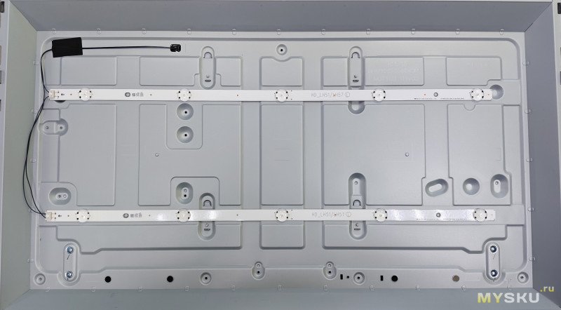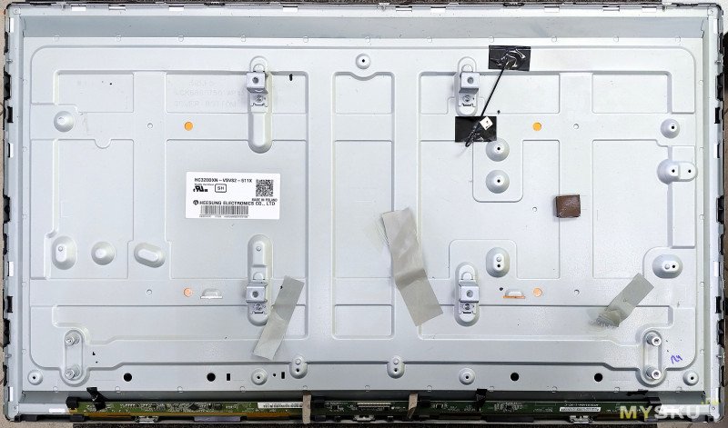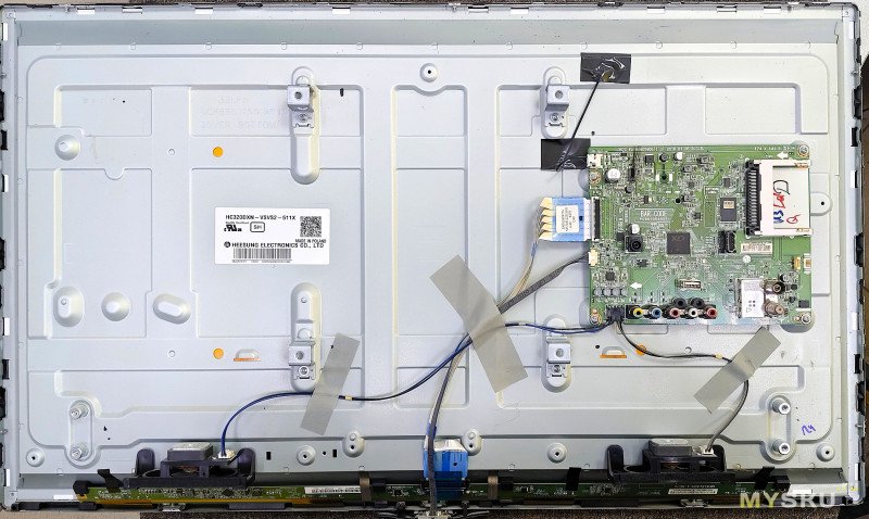 Разберем телевизор. Располагаем его экраном вниз на ровной поверхности, снимаем ножки и откручиваем все винты. Далее снимаем заднюю крышку, она держится на защелках. Начинать отщелкивать (с помощью плотной пластиковой карточки) нужно с углов снизу (там есть отверстия для этого), снизу аккуратнее — там есть шлейфы матрицы, их расположение будет видно на фото ниже.