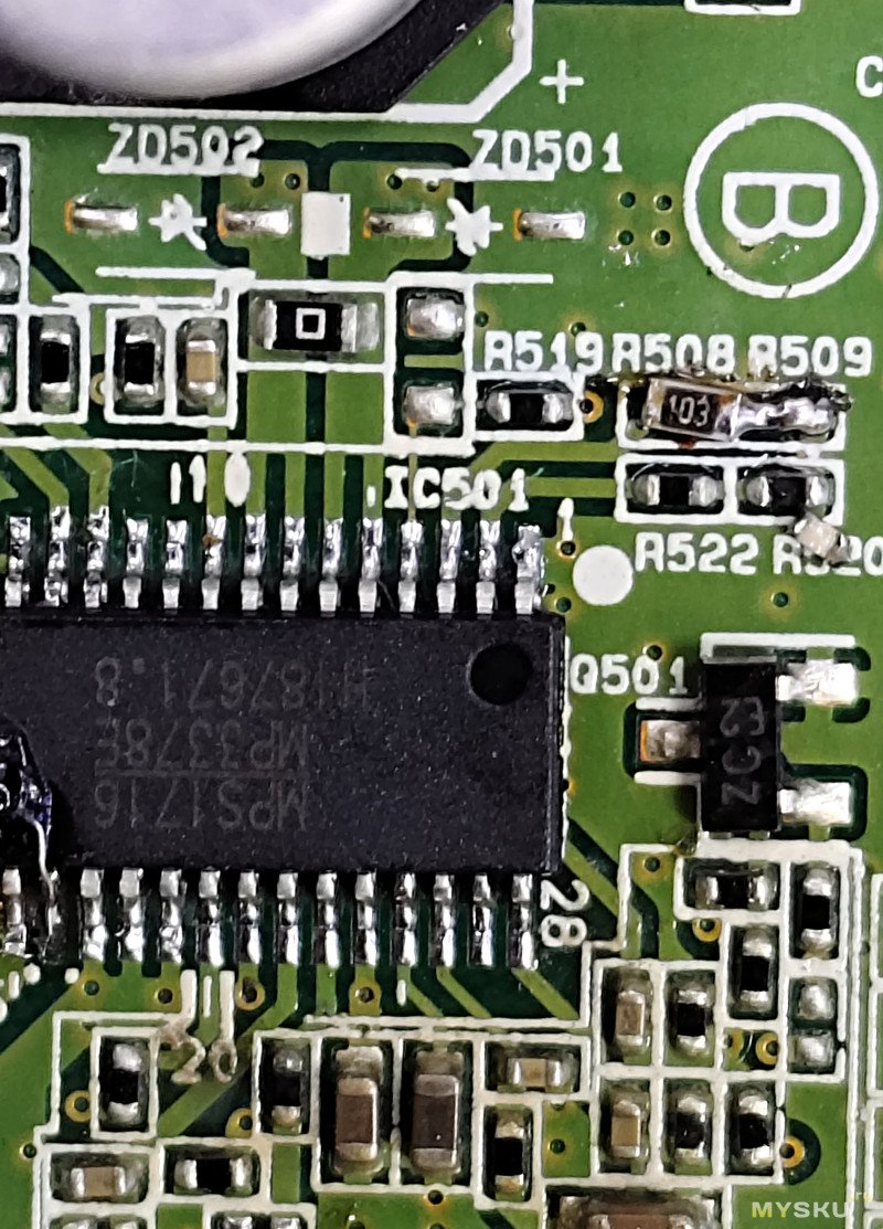 Можно еще снизить ток на подсветку. Для этого необходимо пропорционально увеличить общее сопротивление резисторов R508, R509 от вывода 3 (ISET) на корпус. В моем случае сопротивление было 7.5kOm, я их убрал и поставил один на 10kOm (соседний резистор заменил перемычкой что бы был контакт с землей)
