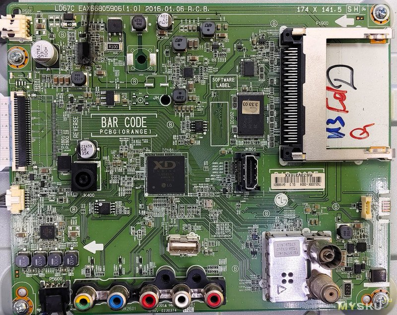 Крышка снята, внутри системная плата с маркировкой EAX66805906 1.0