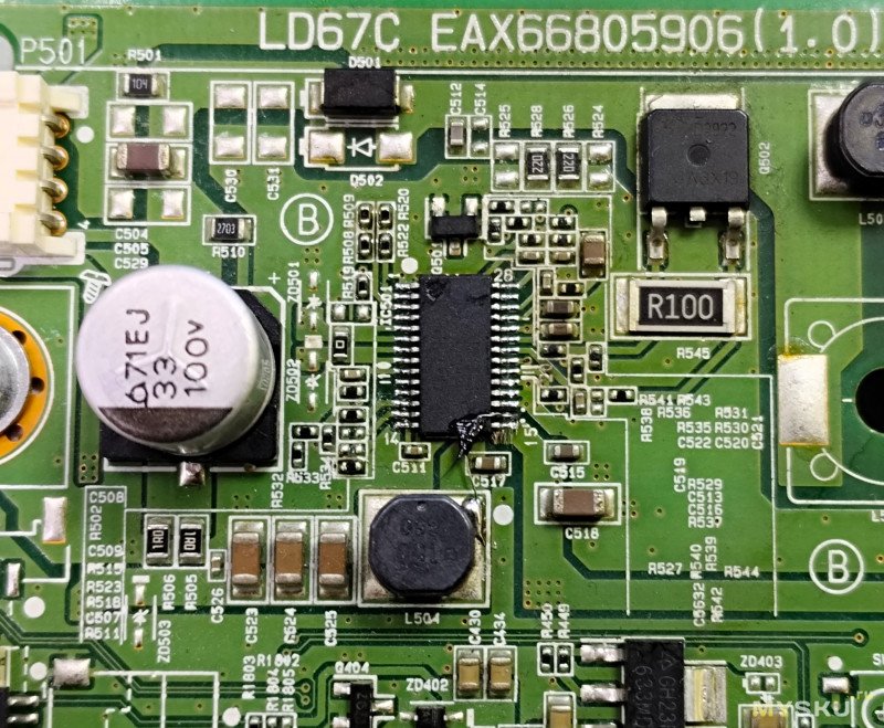 Осмотрев плату я сразу увидел, что на плате сгорел LED драйвер MP3378E.И как я ранее писал — возможной причиной неисправности еще иногда бывает выход из строя стабилизатора IC404 (gh23h или 1117 adj), проверил — на входе напряжение есть, а выход — тоже. Точную цифру не помню, но примерно 1.5v и выше.