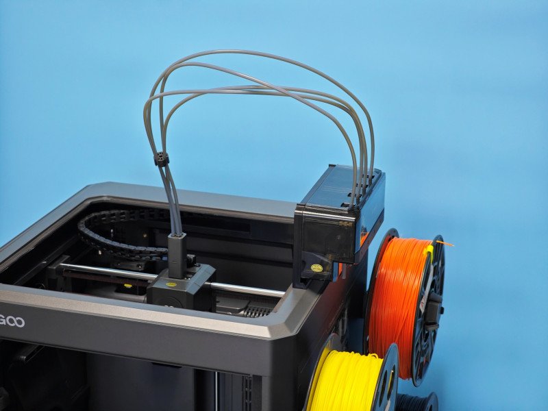 Сразу скажу, что это бюджетная цветная печать, со всеми вытякающими. А именно — есть несколько нюансов, которые не позволяют поставить его в один ряд с Bambulab P2S Combo (нет сушки филамента) или с принтерами-тулченджерами (много отходов при печати). Тем не менее, принтер массивный, закрытый металлическими панелями по бокам, спереди — дверца из тонированного стекла, сверху — съемная крышка (акрил). Внешний размер принтера около 50 х 48 х 75 см (если считать с крышкой, без крышки 49 см, но торчат тефлоновые трубки).