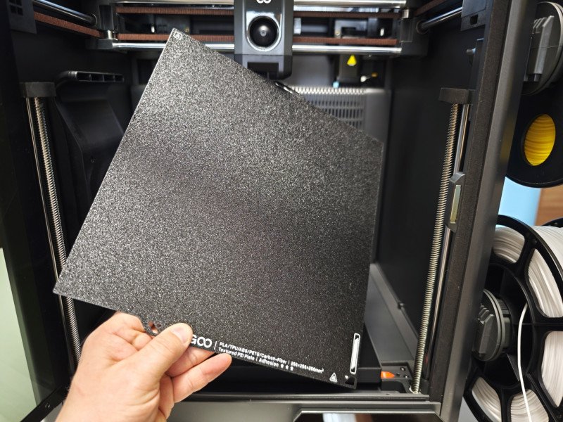 Двусторонняя PEI пластина в комплекте, стальная с фактурным покрытием. Жирный плюс на мой взгляд, практически нет проблем с адгезией, да и подходят аналогичные PEI пластины от Bambulab (256х256 от Р1/Р2, по размеру подходят, будут чуть-чуть меньше по форме стола, стоят 400-500-600 рублей за пластину).