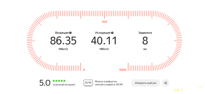 В пределах комнаты всё отлично, через толстые стены скорость падает, но остаётся достаточно высокой для видео и работы. В самой дальней точке от роутера получил следующие результаты: входящая 85 Мбит/с, исходящая 40 Мбит/с. Видно, что роутер заметно мощнее, чем Wi-Fi-модуль в мини-ПК. Тесты проводились с роутером Netis NX62, у которого по четыре антенны на каждый диапазон. Расстояние в последнем тесте было около семи метров и четыре стены из кирпича.
