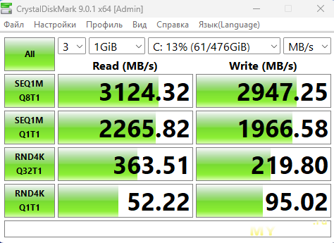 М.2-накопитель выдаёт около 3600/3100 MB/s, что максимум для PCIe 3.0, а именно эта шина используется в устройстве. Так что покупать супербыстрые SSD на PCIe 4.0 нет смысла — разницы не будет, только бессмысленная переплата денег.