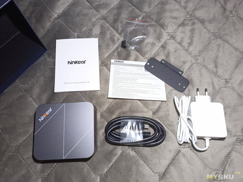 Поставляется устройство в строгой чёрной коробке, внутри — всё необходимое: сам ПК, блок питания на 65 Вт, крепление VESA, HDMI-кабель и документация. Сам корпус маленький, почти квадратный, металлический и приятно тяжёлый — чувствуется, что вещь сделана не из фольги.