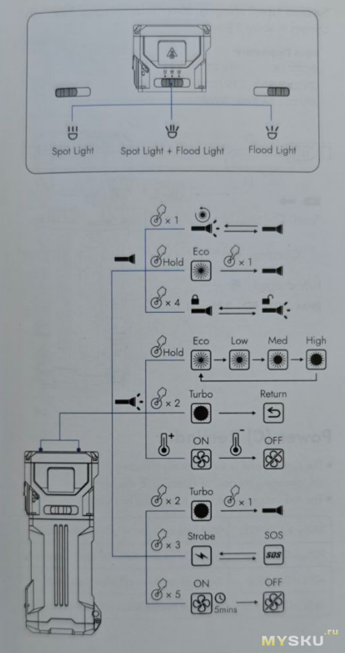 Управляется фонарь в основном кнопкой и переключателем, которым можно переключить светить заливным светом, относительно узким лучом или всё сразу.