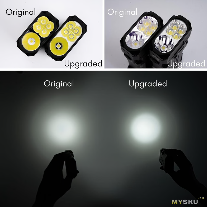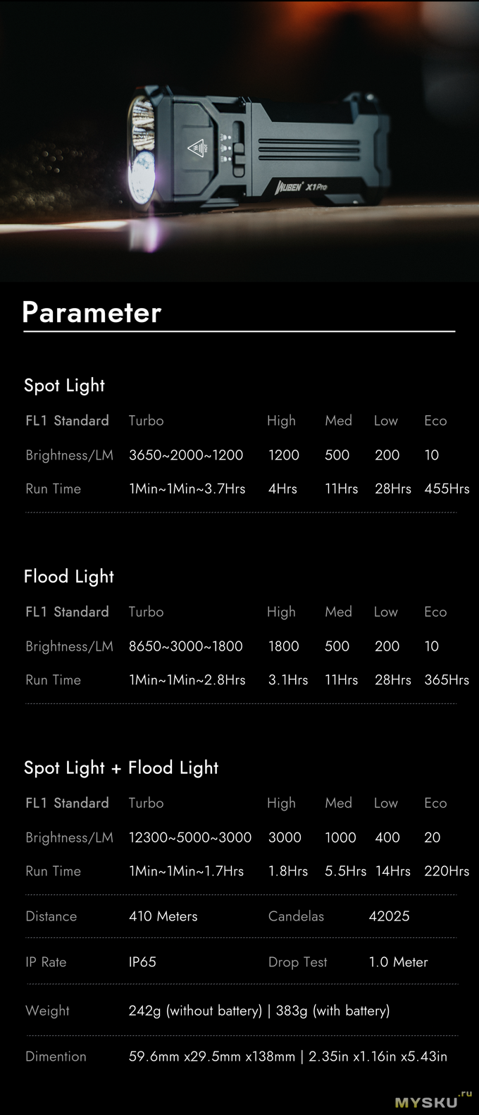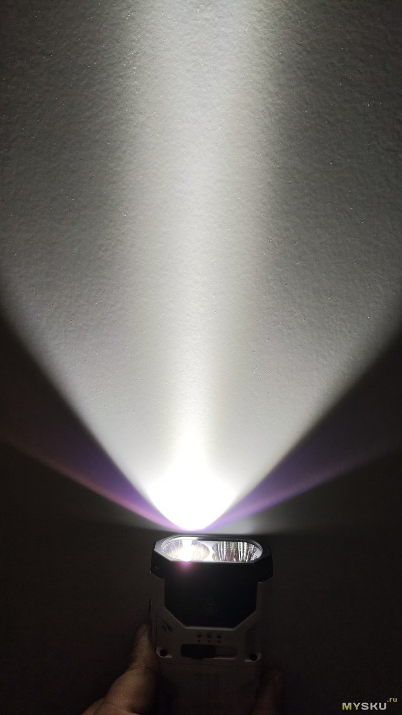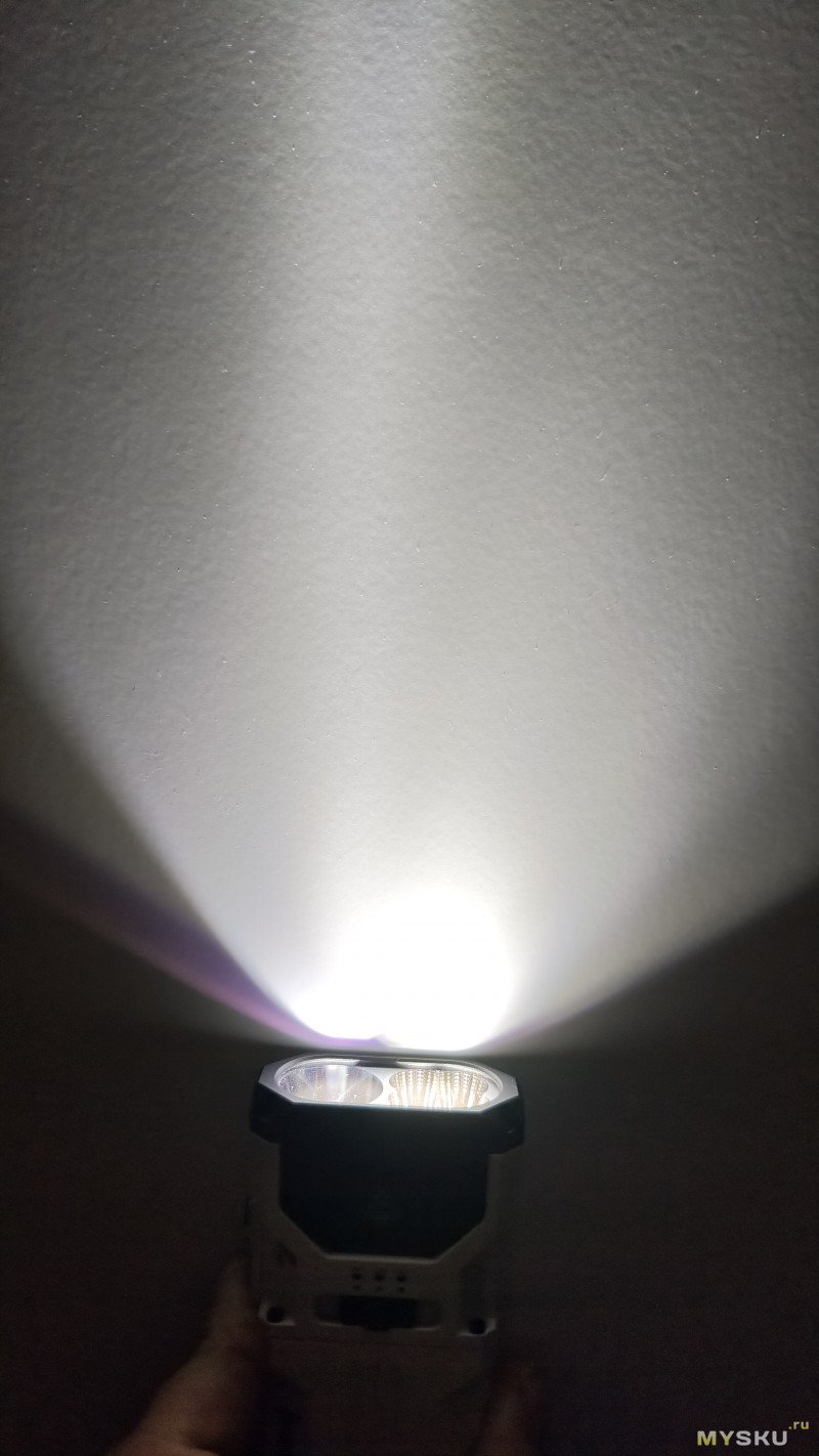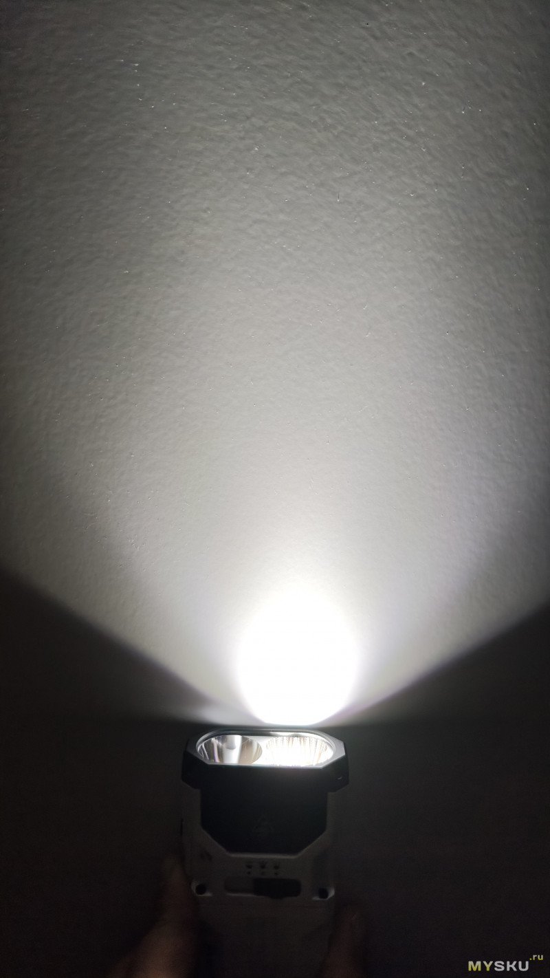 Фото делал с помощью телефона. Заблокировал уровень яркости(ISO, выдержка итд.) на высокой яркости фонаря и от неё отталкивался в дальнейших фото. Фото в режиме Спот/Луч, Флуд/Заливной свет и Максимальный режим(Спот+Флуд).