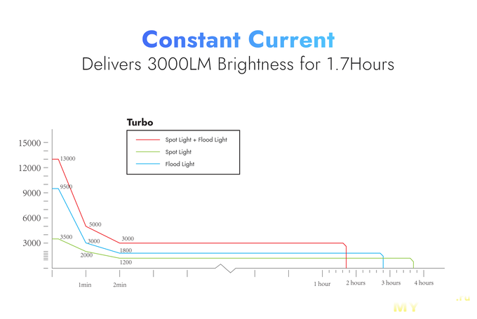 Кстати, если кто-то пропустил информацию со скрина в начале обзора, режим турбо светит 1 минуту, потом снижает яркость в 2-3 раза на ещё одну минуту, потом снижает последний раз и работает на высоком уровне яркости.