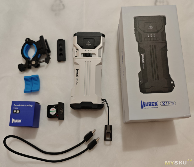 Поставляется в очень плотной картонной коробке, очень напоминающей типичную добротную коробку от смартфона. При заказе я выбрал дополнительные аксессуары: запасной кулер и крепление на руль велосипеда. Так как сбор на Кикстартере набрал определённые суммы сверх необходимой, то в комплекте появился шнурок совмещённый с кабелем зарядки(Usb-C двухсторонний) и крепление на ремень.