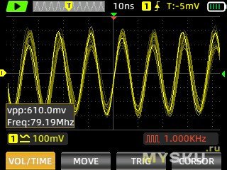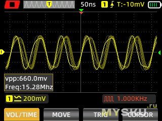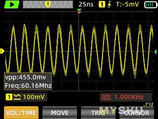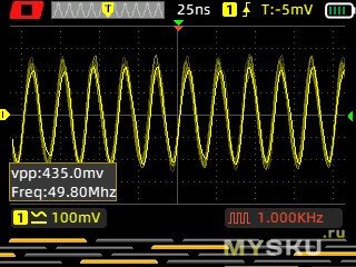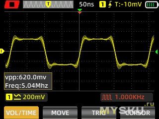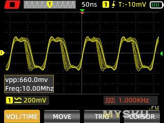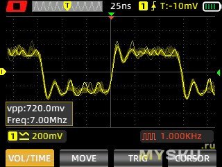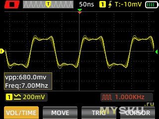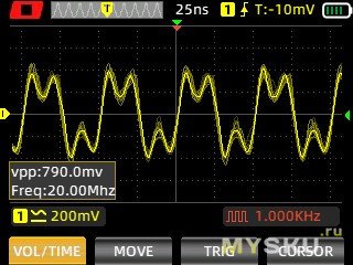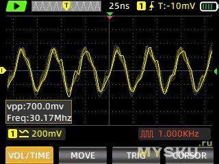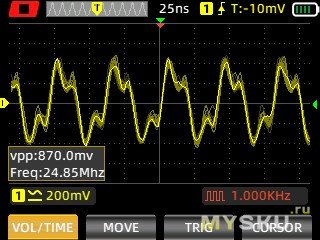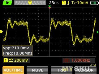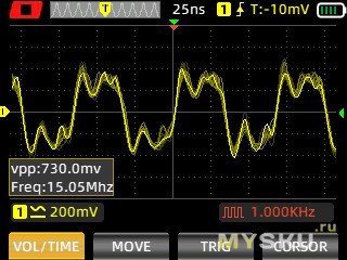 Если увеличить развертку до 25 нс — дикий эффект Барта Симпсона, 10 Мгц начинают или двоиться, или покрываются складками. 15 Мгц — на 50 нс почти синусоида, на 25 нс — ну, наверное в этом горном массиве должен быть спрятан меандр.