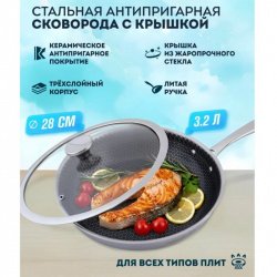 Большая сковорода со стеклянной крышкой в комплекте. Капсульное дно обеспечивает равномерный нагрев. Работает на всех видах плит. Можно мыть в посудомоечной машине. Имеется керамическое антипригарное покрытие с сотовым рисунком Honeycomb.