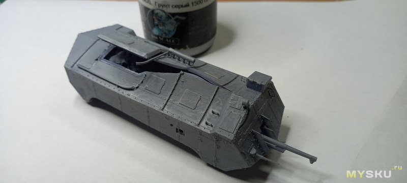 А так после грунтовки. Сразу же видна мелкая деталировка. Да и сама такая пластмасса требует обязательной грунтовки, причем именно тонким слоем.